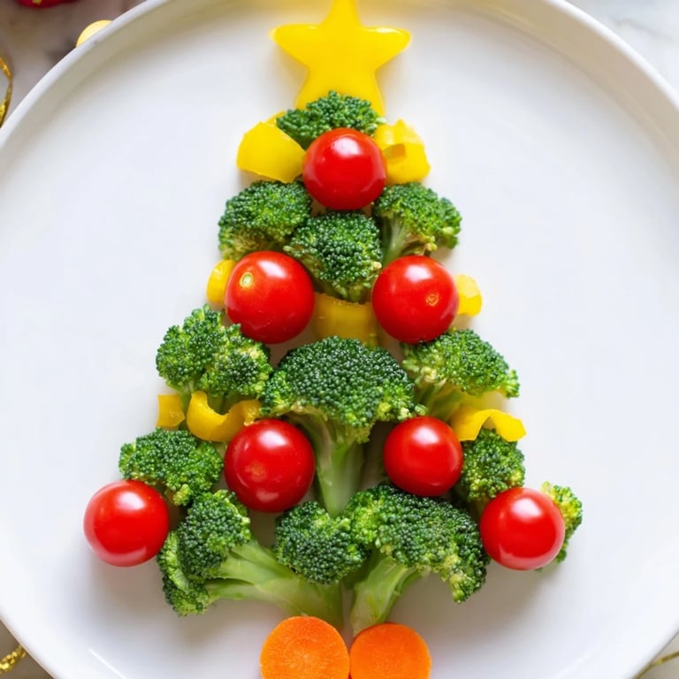 Pin A whimsical and healthy party platter featuring broccoli florets arranged as a festive tree, adorned with vibrant cherry tomato ornaments. Perfect for holiday gatherings or a fun snack for kids.