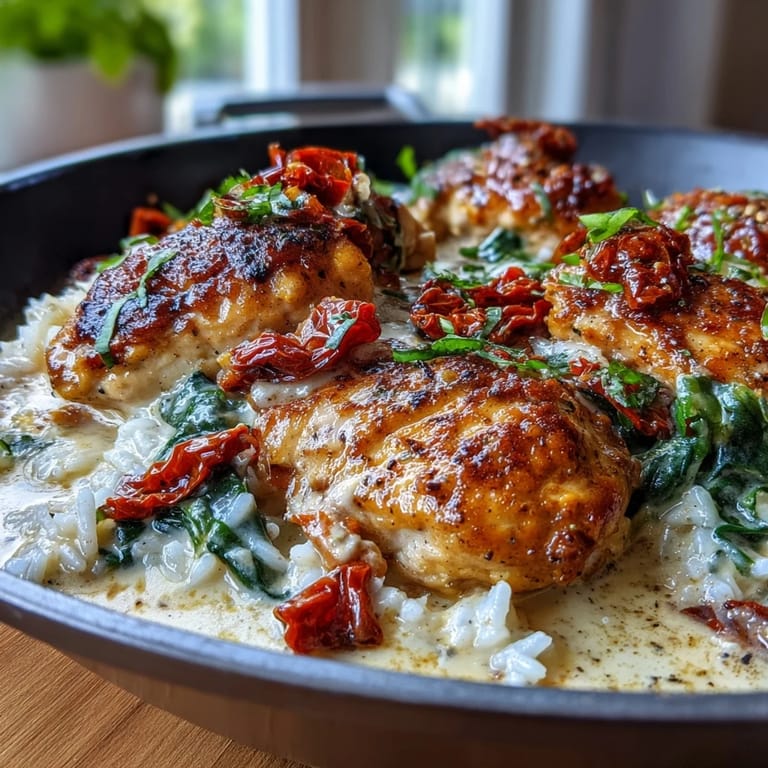 Pin This Creamy Tuscan Chicken Rice Skillet brings the elegant flavors of a classic Italian restaurant into a simple, one-pan home-cooked meal. Featuring golden-seared chicken and fluffy rice enveloped in a rich garlic-Parmesan sauce, it’s a hearty and comforting dish that the whole family will enjoy. The combination of sun-dried tomatoes and fresh spinach adds vibrant color and a punch of flavor that perfectly balances the richness of the cream sauce.