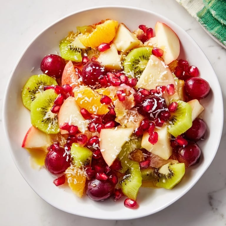 Pin A refreshing winter fruit salad featuring a blend of seasonal fruits, tossed in a light citrus-honey dressing and topped with coconut flakes for a festive snow-like touch.