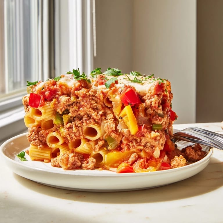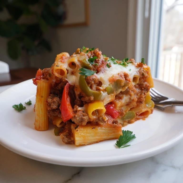 Pin Baked Rigatoni with Sausage & Peppers is a comforting Italian-American dish that brings together tender rigatoni pasta, flavorful Italian sausage, and a colorful mix of bell peppers all simmered in a rich tomato sauce. This hearty casserole is then baked to golden, bubbly perfection beneath a generous layer of melted mozzarella and Parmesan cheeses, making it an irresistible meal perfect for family dinners or cozy nights in.