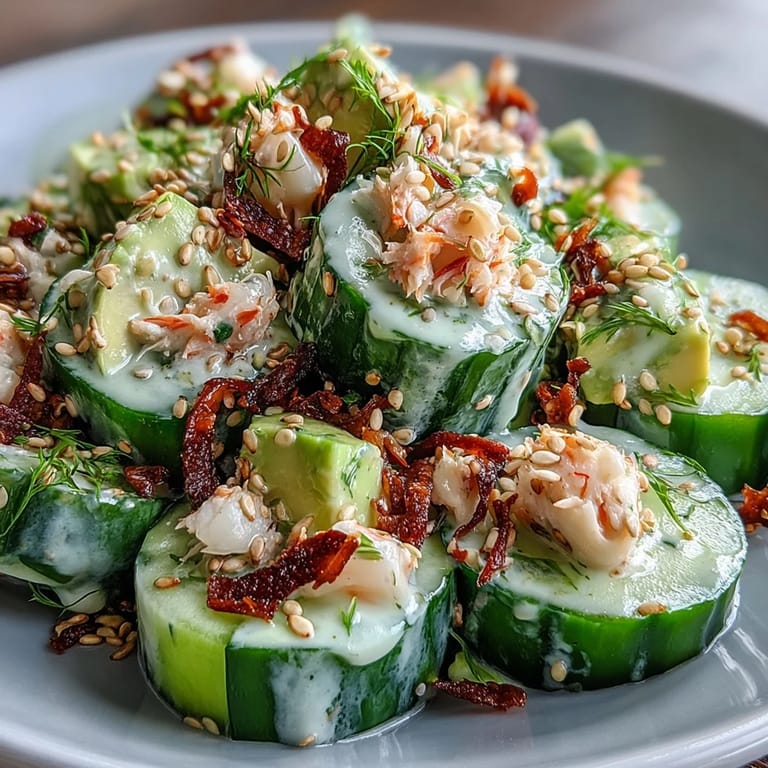 This vibrant dish blends thinly sliced cucumbers with creamy avocado and tender crab meat, all coated in a rich sushi-style dressing featuring mayo, cream cheese, and soy sauce. Lightly salted cucumbers drain excess moisture for a crisp texture. Tossed gently with scallions or radishes if desired, then garnished with sesame seeds, it’s a quick, fresh appetizer perfect for warm days or casual gatherings. Serve chilled or immediately for optimal flavor and texture.