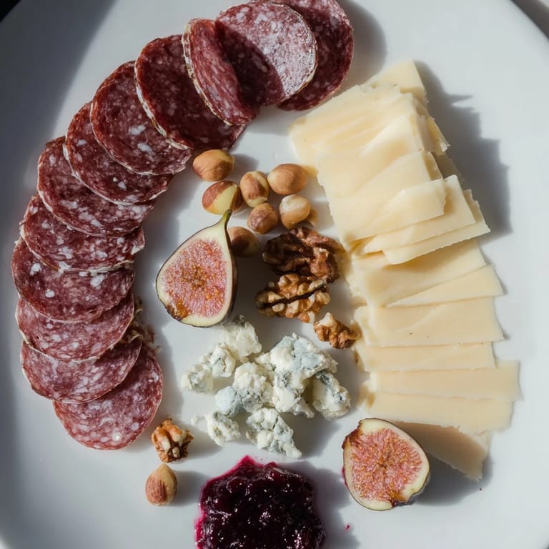 This elegant charcuterie board showcases thinly sliced venison salami, smoked elk sausage, and wild boar prosciutto arranged with aged cheddar, smoked gouda, and crumbled blue cheese. Complemented by dried figs, mixed nuts, cornichons, grapes, wild berry jam, and rustic crackers, it's garnished with fresh rosemary and optional deer antlers for a wild, sophisticated presentation. Ideal for easy and quick assembly, perfect for gatherings or as a flavorful appetizer centerpiece.