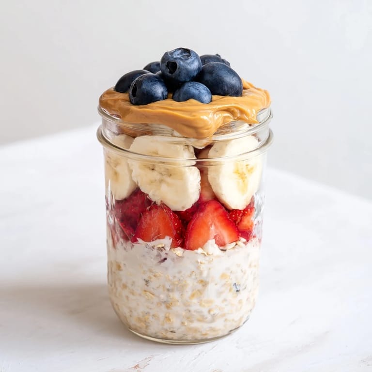 Pin A creamy, nutritious breakfast featuring layers of oats, juicy fruit, and rich peanut butter, all prepared the night before for a quick and healthy start.