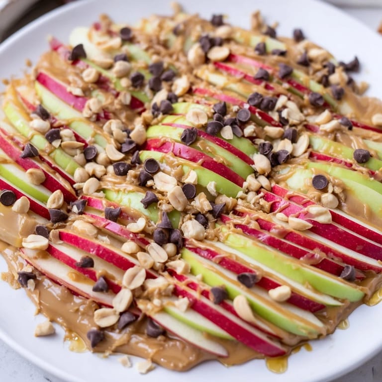 This delightful snack combines thinly sliced apples with creamy peanut butter, drizzled honey, and crunchy nuts. Quick to prepare in just 10 minutes, it offers a balanced mix of sweet and savory flavors perfect for any time. Optional toppings like chocolate chips and shredded coconut add texture and variety, making it suitable for all ages and dietary preferences.