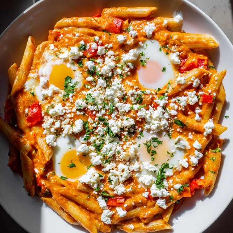 Shakshuka and pasta seem like they shouldn't belong together, but they do because they share the same love language: spice, warmth, and that moment when egg becomes your sauce. The tomato base gives you comfort, the spices give you intrigue, and the egg gives you luxury without any cream. I've never made this twice the same way because there's room to play—more chili if you're feeling bold, feta if you want tang, extra garlic if you love it aggressive. It's flexible enough to adapt to whatever you have and whatever you're craving.