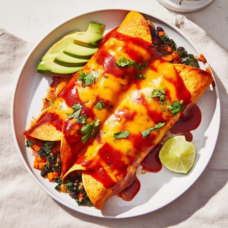 Pin A vibrant, nourishing twist on classic enchiladas, featuring roasted sweet potatoes, protein-rich black beans, and hearty kale, all baked together in one pan with zesty enchilada sauce and melty cheese.
