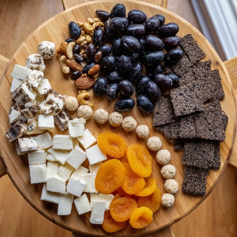 This stunning platter artfully arranges dark olives, rye crackers, aged mushrooms, grapes, and dark chocolate on one side, balanced by white cheeses, rice crackers, nuts, dried fruits, and a honey drizzle. The circular yin and yang layout creates visual harmony and combines bold and delicate flavors for an elegant appetizer or snack. Preparation is quick and simple, making it ideal for gatherings, with options to customize cheese or cracker choices. Pair with sparkling wine or light reds for a sensory delight.